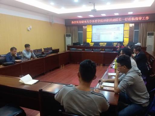 湖南体育职业学院运动系郭世彬主任为我院师生介绍了该校的建设和发展情况,引导师生参观学院的教学场地、训练基地等,介绍了校园文化建设情况以及教师队伍建设、德育管理、教育教学等方面采取的措施和取得的成绩。并重点展示了该校智能信息化教学训练平台­­(世界大学城)的创建历程和经验。两院师生对如何创新体育教育的方法展开了热烈的讨论。田祖国副院长表示,湖南体育职业学院在体育人才培养方面一直走在湖南省的前列,为国家和社会培养了很多优秀人才,特别是郭老师创建并使用的智能信息化教学训练平台,是体育教学与互联网+的充分结合,在体育教学智能信息化方面独树一帜,值得我院师生深入思考和学习。研究生们也纷纷赞赏郭老师的创新实践,将体育教学中的教案+PPT+真人讲解+视频演示+实战视频等多元素集于一体,将理论课堂与实践课堂有机衔接,拓宽了学生的学习空间,促进师生共建共享教学资源。