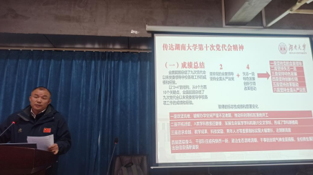 2月27日,华体会(中国)2024年春季学期第一次教职工大会在游泳馆会议室举行,院党委书记田祖国教授传达了湖南大学第十次党代会精神,分别从报告主题、成绩总结、发展之路、总体目标任务、改革发展任务部署、高质量党建任务部署等六个方面全面地学习领会党代会精神。