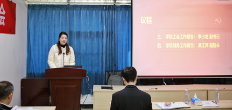 院长王祚亮代表班子做学院年度工作报告,他从回顾与总结、目前面临的形式以及学院未来工作的思考三个方面进行了阐述。院党委副书记、工会主席李小龙和副院长吴江萍分别作2023年度工会工作报告和2023年度财务工作报告,全体代表审议并举手表决通过了上述三个报告。