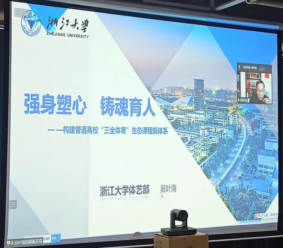 11月23日上午,应华体会(中国)邀请,浙江大学公共体育与艺术部主任吴叶海教授在线上做了题为《强身塑心 铸魂育人》的专题讲座,分享了浙江大学“三全体育”生态课程新体系,以及从事体育教育十多年的经验、管理、思考。讲座由王祚亮院长主持,学院全体师生参与。