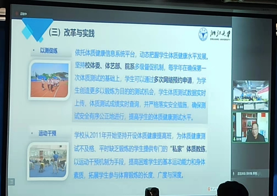 吴教授以传承与发展、定位与目标、改革与实践、成效与成果四个方向分享了浙江大学建校以来至今体育课程的发展建设情况。在顶层设计的引导下,以国家政策导向为行动指南,建立浙江大学特色“三全体育”课程体系,四位一体“全方位”体育教育目标,四纵四横“全成员”教学体系,五位一体“全过程”教育教学路径。