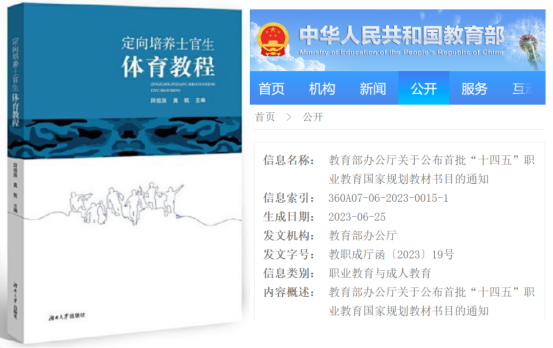 近日,教育部办公厅发布《华体会官方网页版公布首批“十四五”职业教育国家规划教材书目的通知》(教职成厅函〔2023〕19号),我院田祖国教授主编的《定向培养士官生体育教程》入选首批“十四五”职业教育国家规划教材,属于高职专科类公共基础课“十四五”职业教育国家规划教材(新申报教材)。